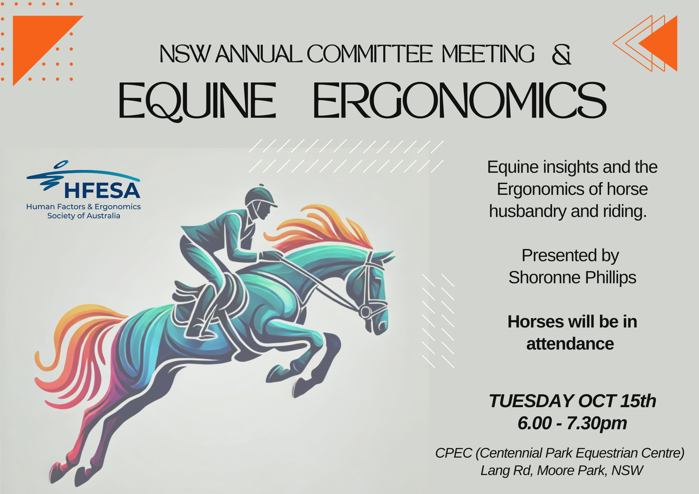 15/10/2024 @ 6:00 pm – 7:30 pm – Join us for an interactive night exploring the Equine insights and the Ergonomics of horse husbandry and riding. There will be demonstration of different types of tack (bits, bridles, girths, saddles, etc) with an explanation of the different uses for each. Discussions on the manual handling and safety issues around horses and the environment will […]