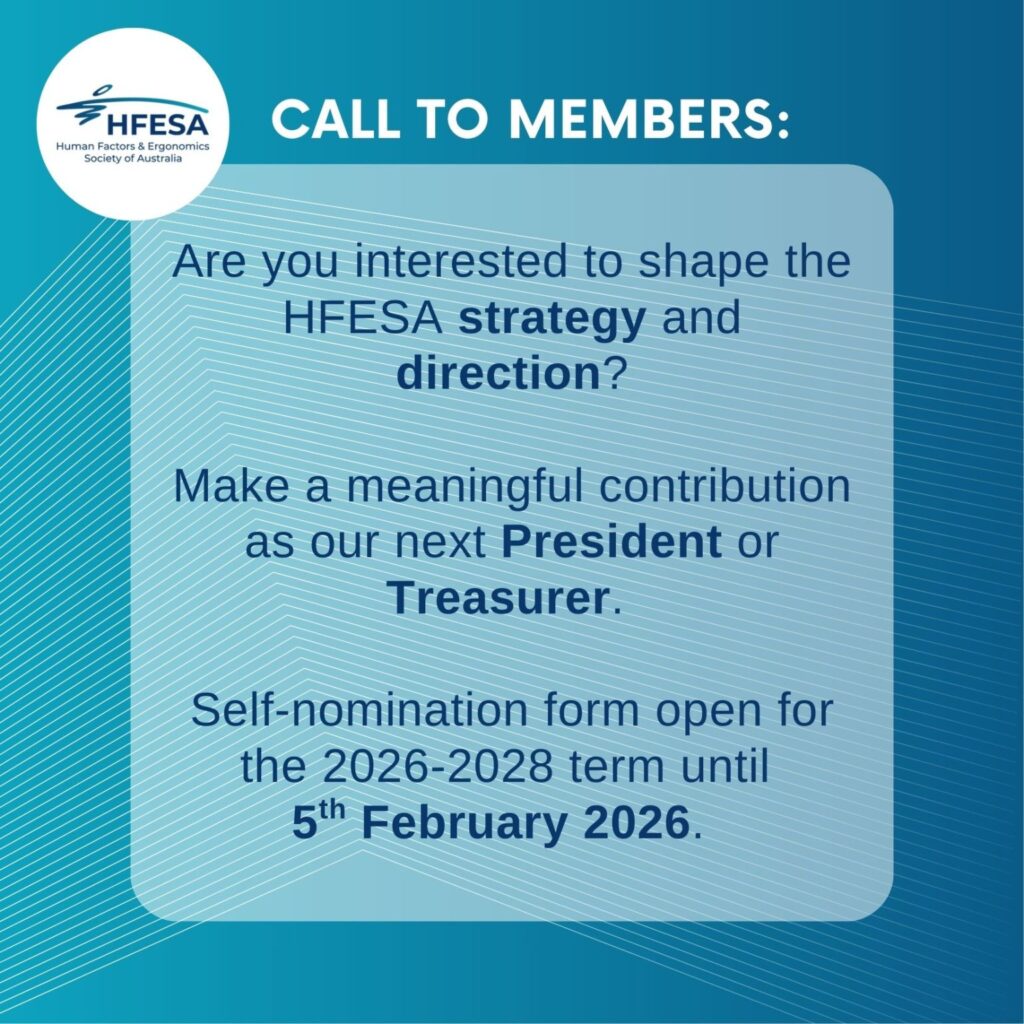 Nominations for HFESA Director positions for Dec 2026 – Dec 2028 term open now! HFESA members with an interest in forming the direction and strategies of HFESA are welcome to nominate for incoming president or incoming treasurer using this form: Human Factors & Ergonomics Society of Australia – HFESA Executive Nomination Form | WAVE